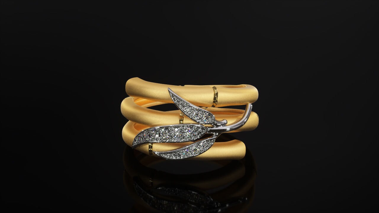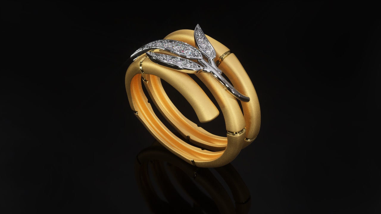 Sold OutAs this is a 2 tone ring, please let us know the color breakdown you prefer. Let us know what color gold (yellow, white, rose, green or plating combination) you would like for the bamboo ring and the top leaf