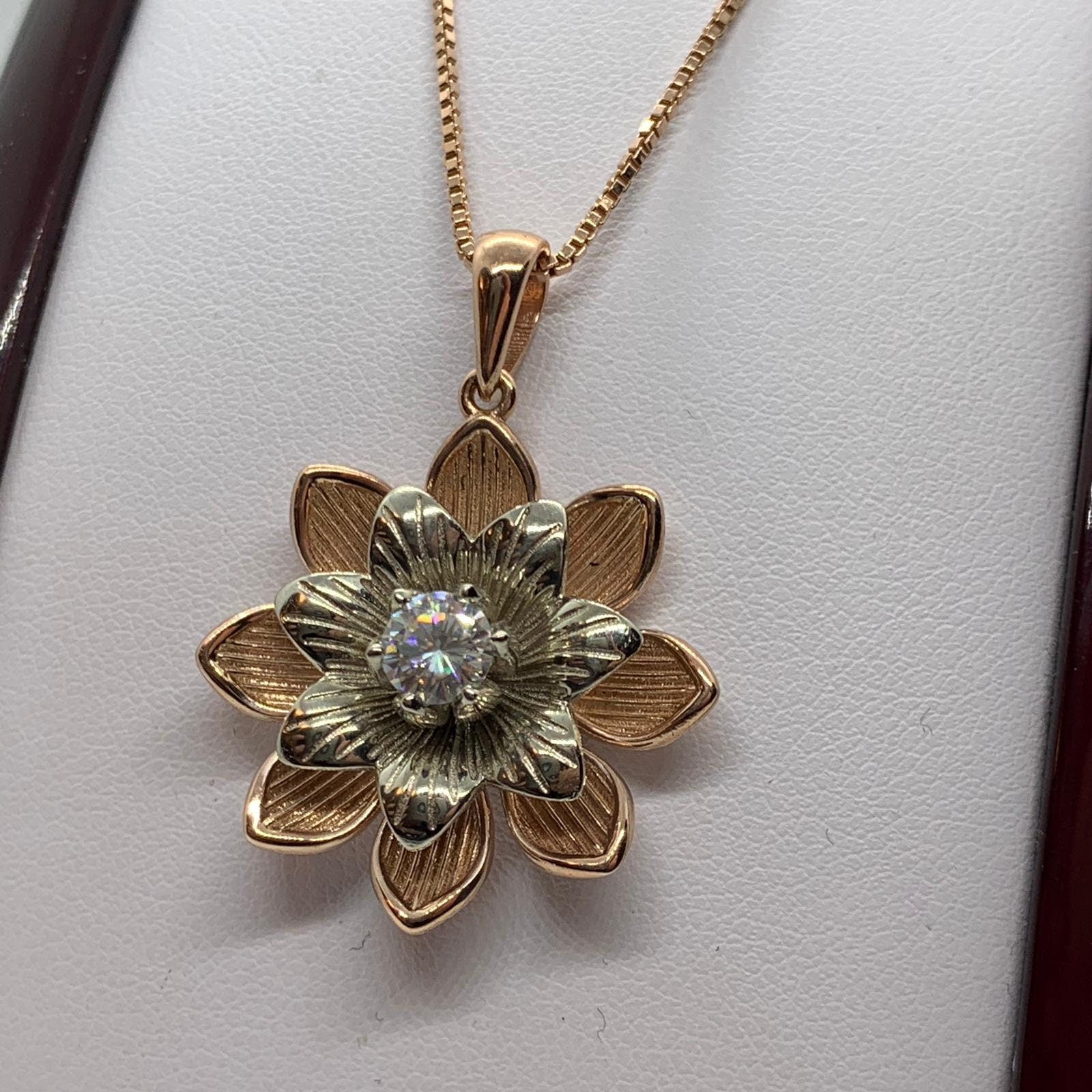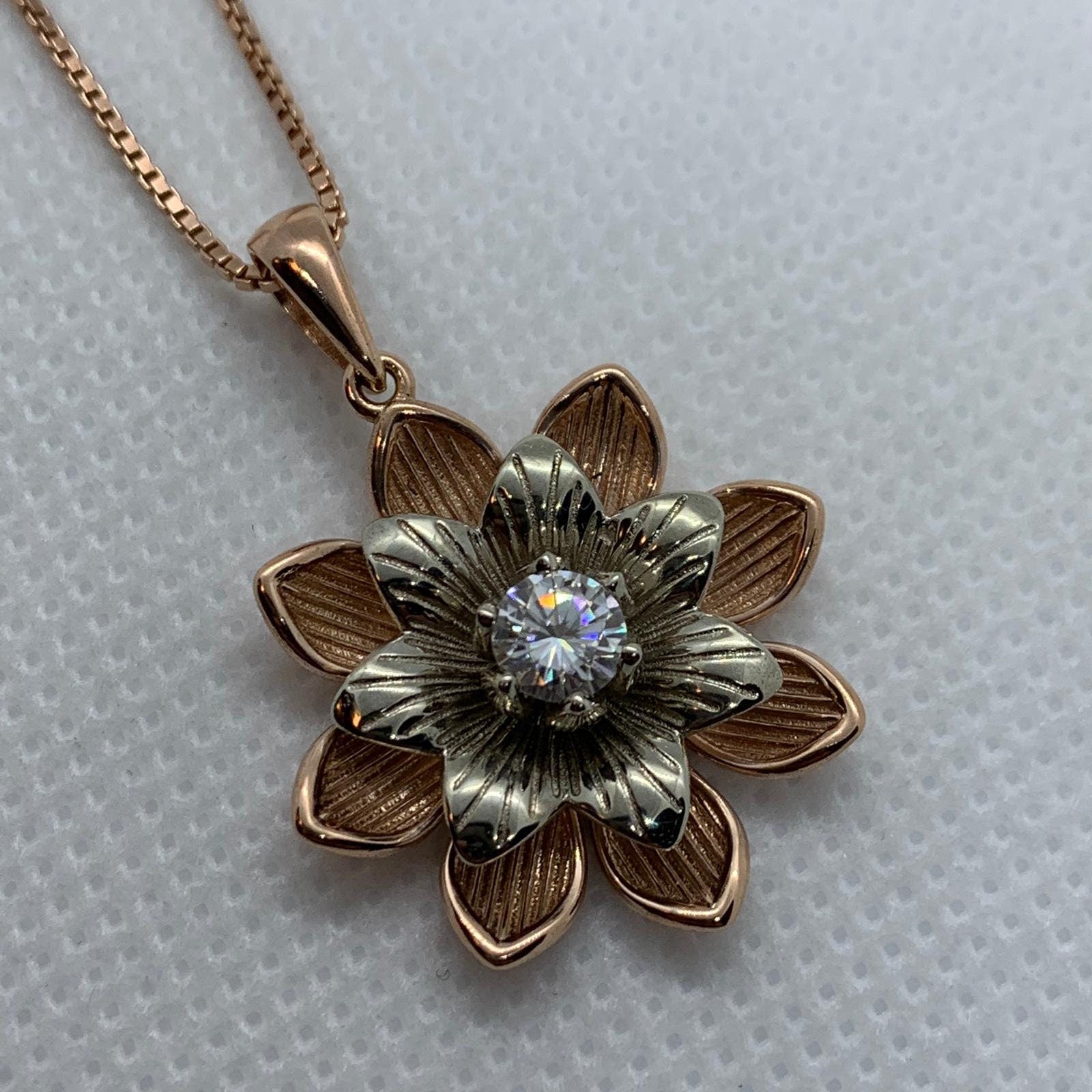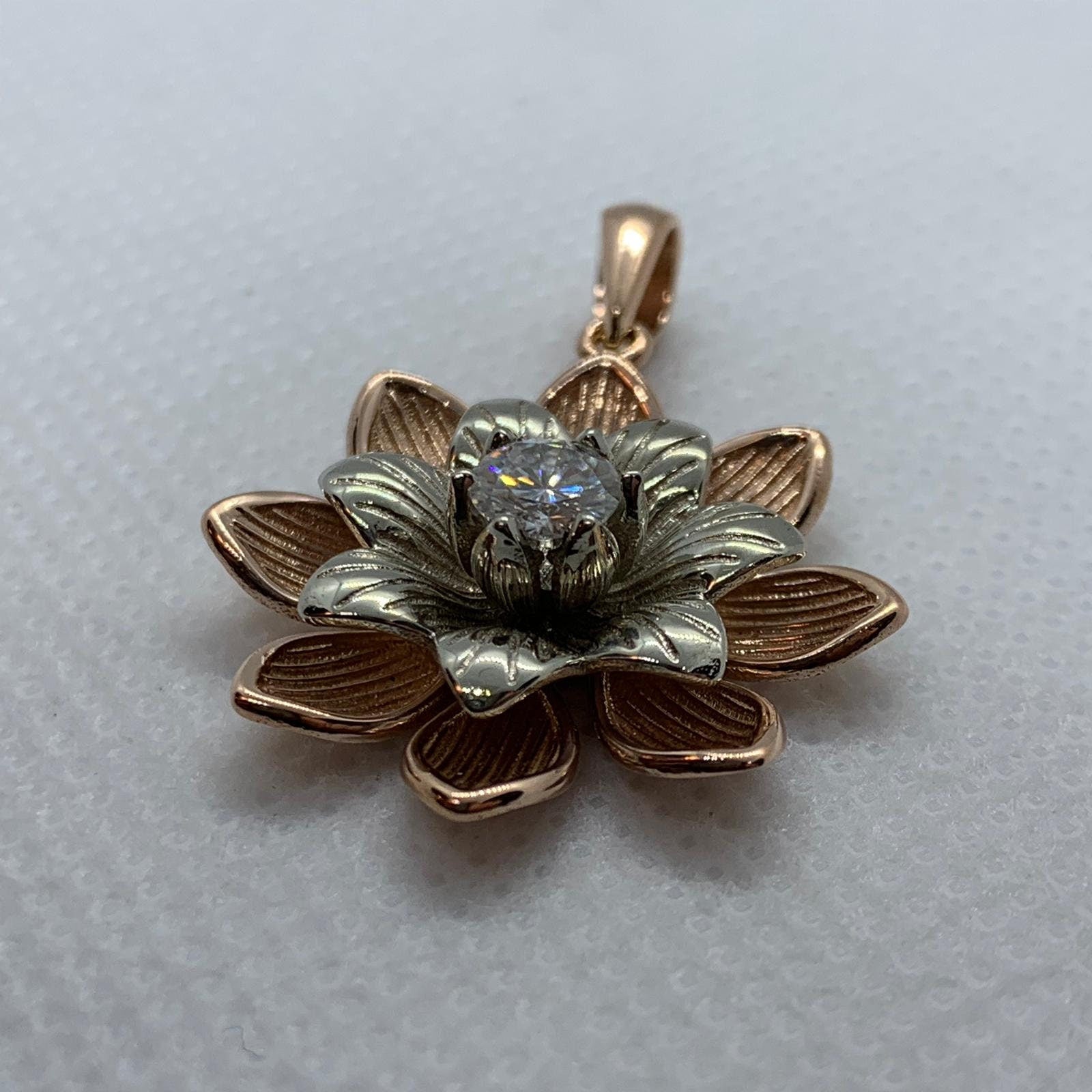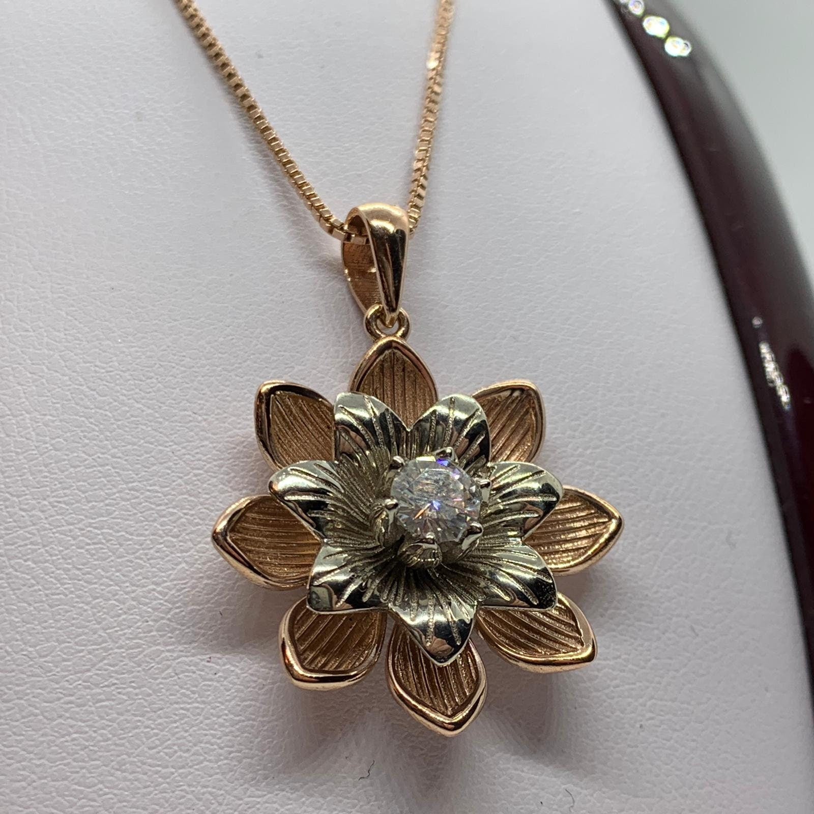 Sold OutAs this is a 2 tone pendant, please let us know the color breakdown you prefer. Let us know what color gold (yellow, white, rose, green or plating combination) you would like for the upper petal and the lower petal.