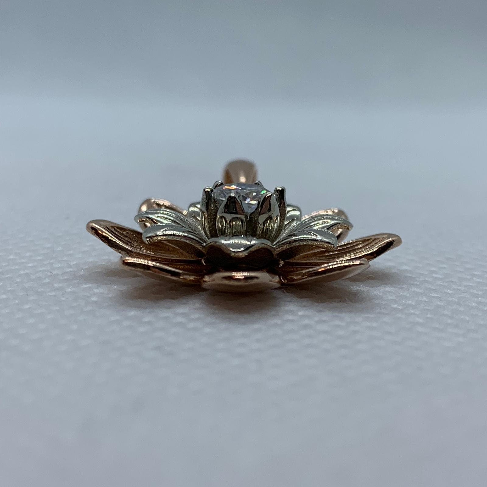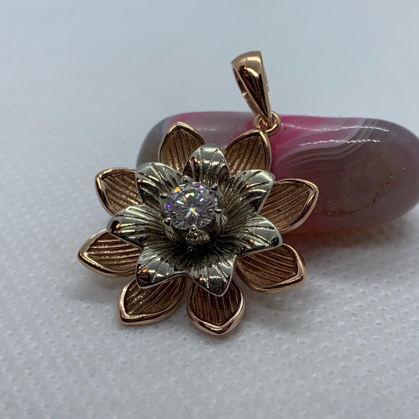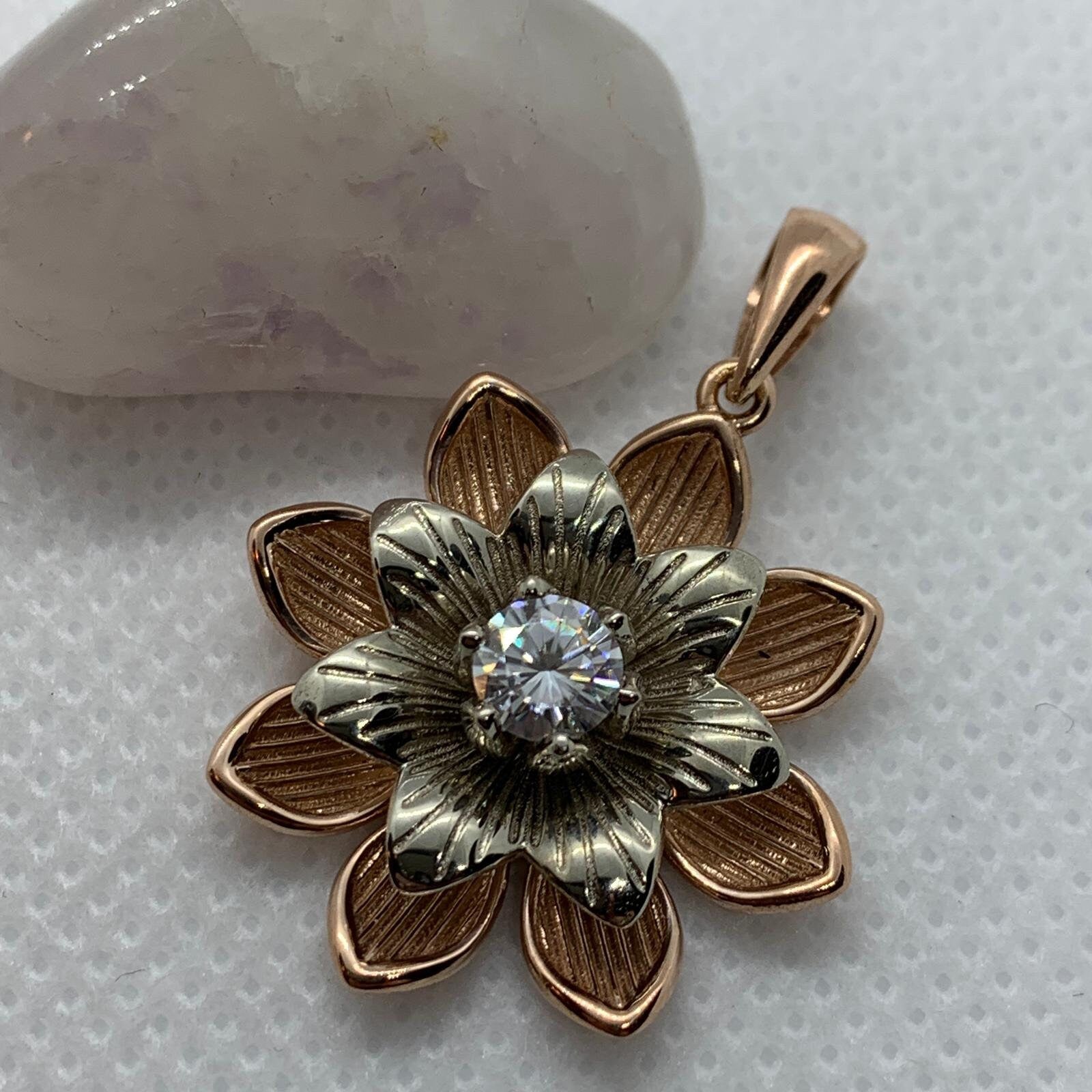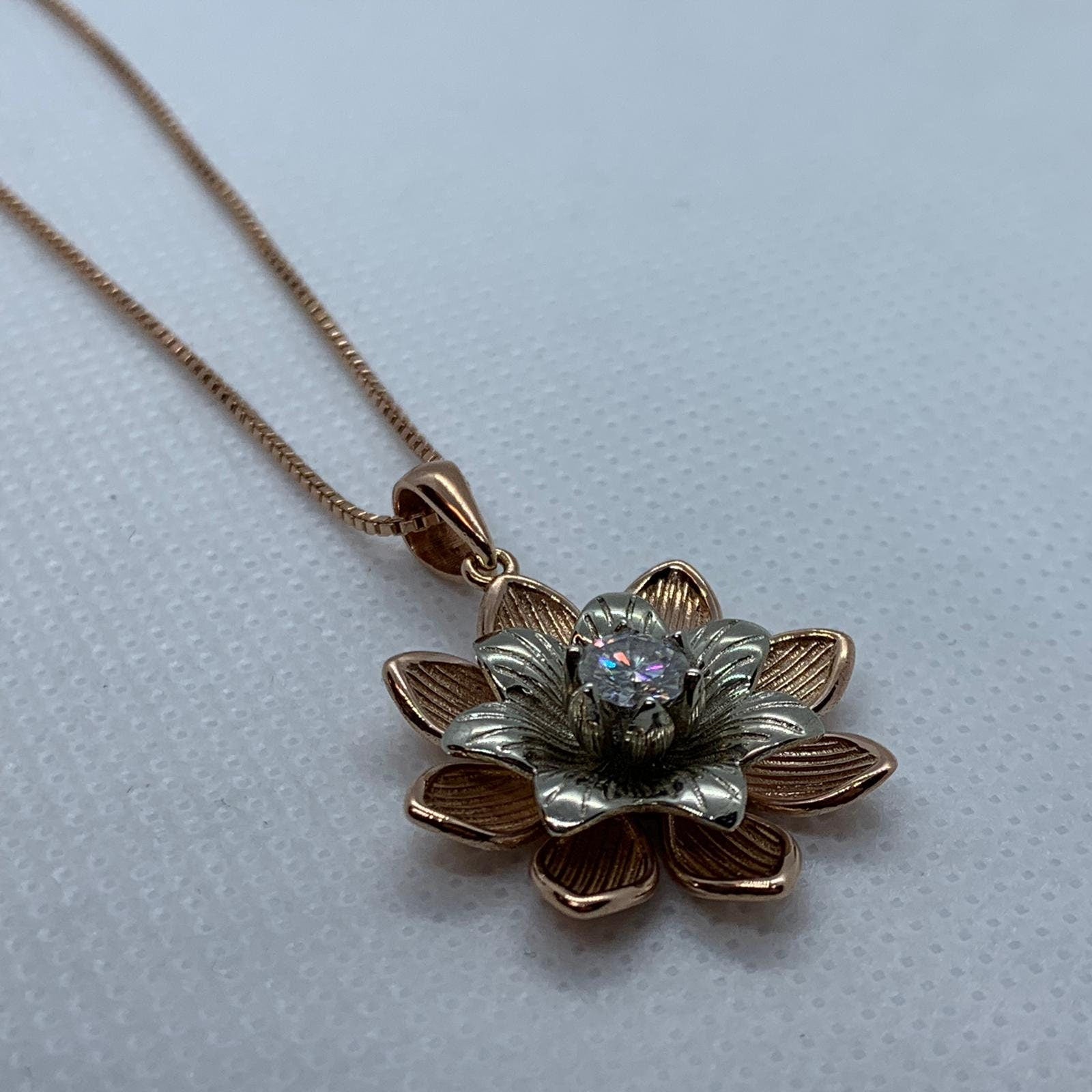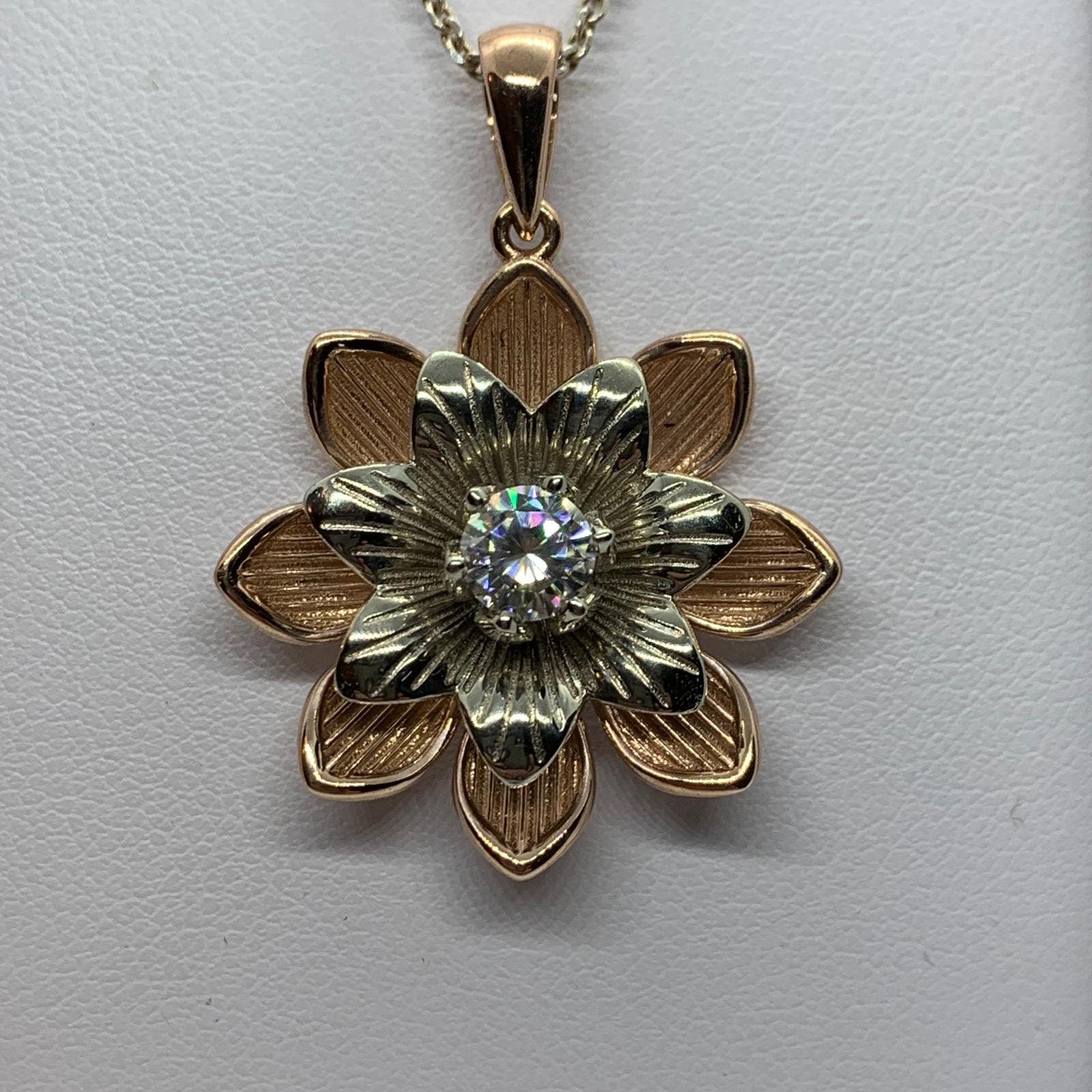 Sold OutAs this is a 2 tone pendant, please let us know the color breakdown you prefer. Let us know what color gold (yellow, white, rose, green or plating combination) you would like for the upper petal and the lower petal.