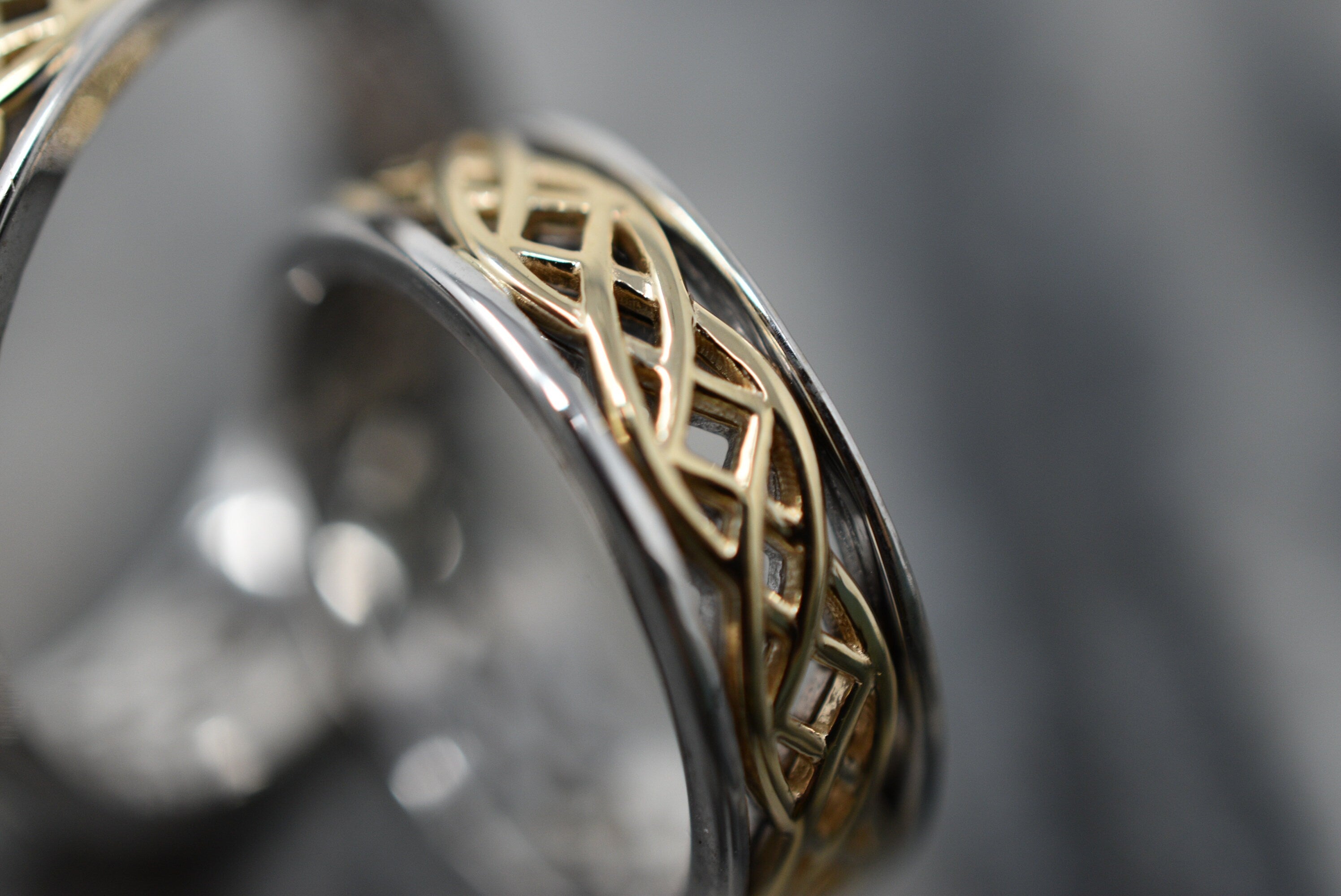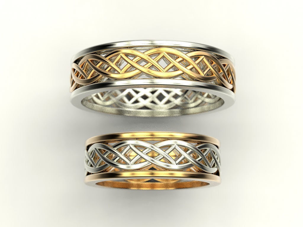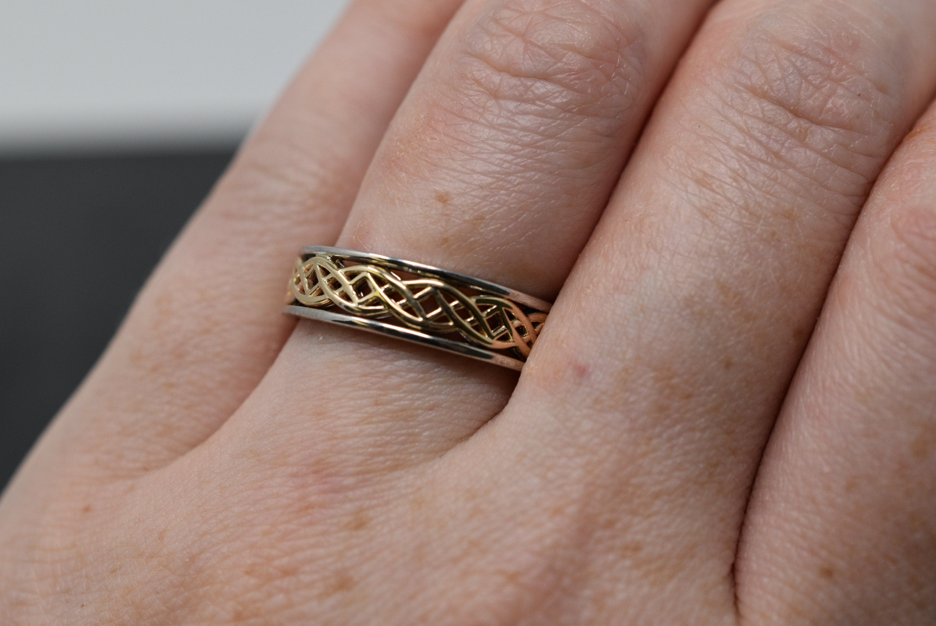 As this is a 2 tone ring, please let us know the color breakdown you prefer. Let us know what color gold (yellow, white, rose, green or plating combination) you would like for inside portion and the outside portion.