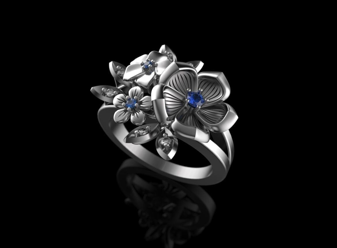 Fiorella Flower Ring *Sapphire With 10k/14k/18k White, Yellow, Rose, Green Gold, Gold Plated & Silver* Bouquet Rose Daisy Petal Leaf Nature