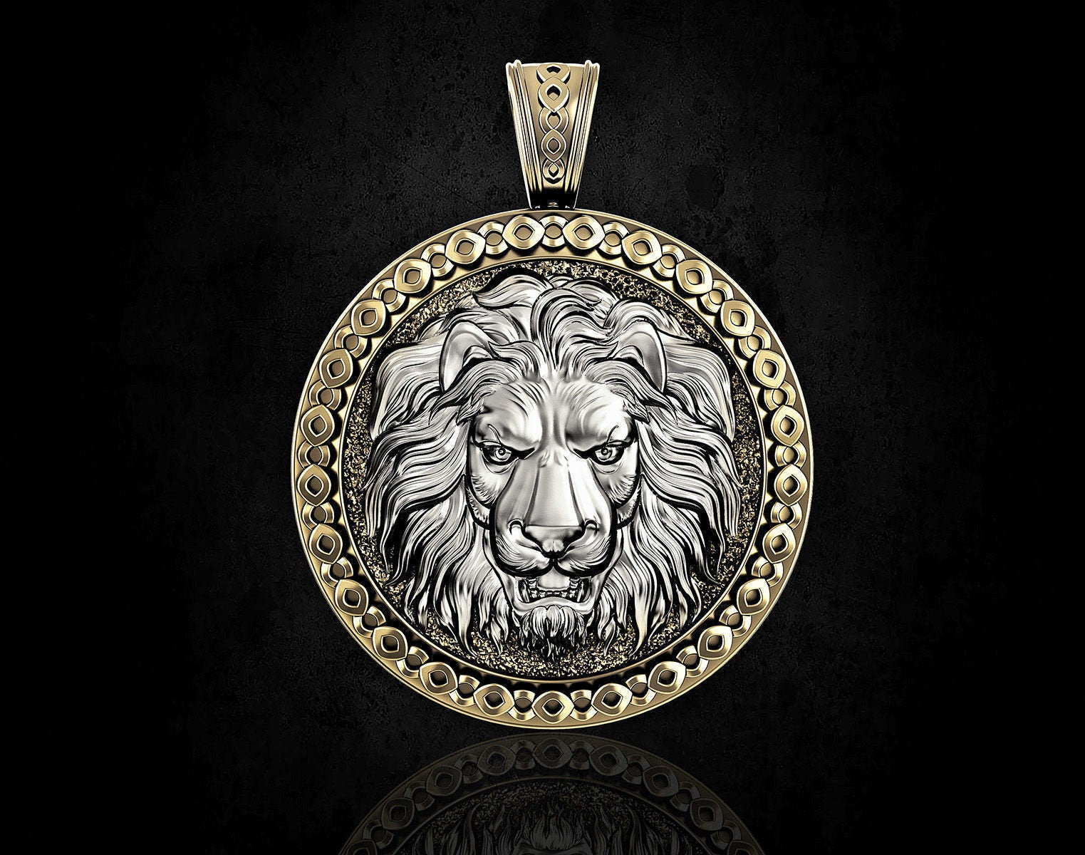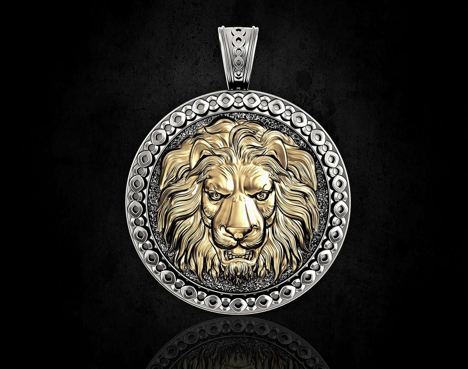 As this is a 2 tone pendant, please let us know the color breakdown you prefer. Let us know what color gold (yellow, white, rose, green or plating combination) you would like for outer portion and the lion.