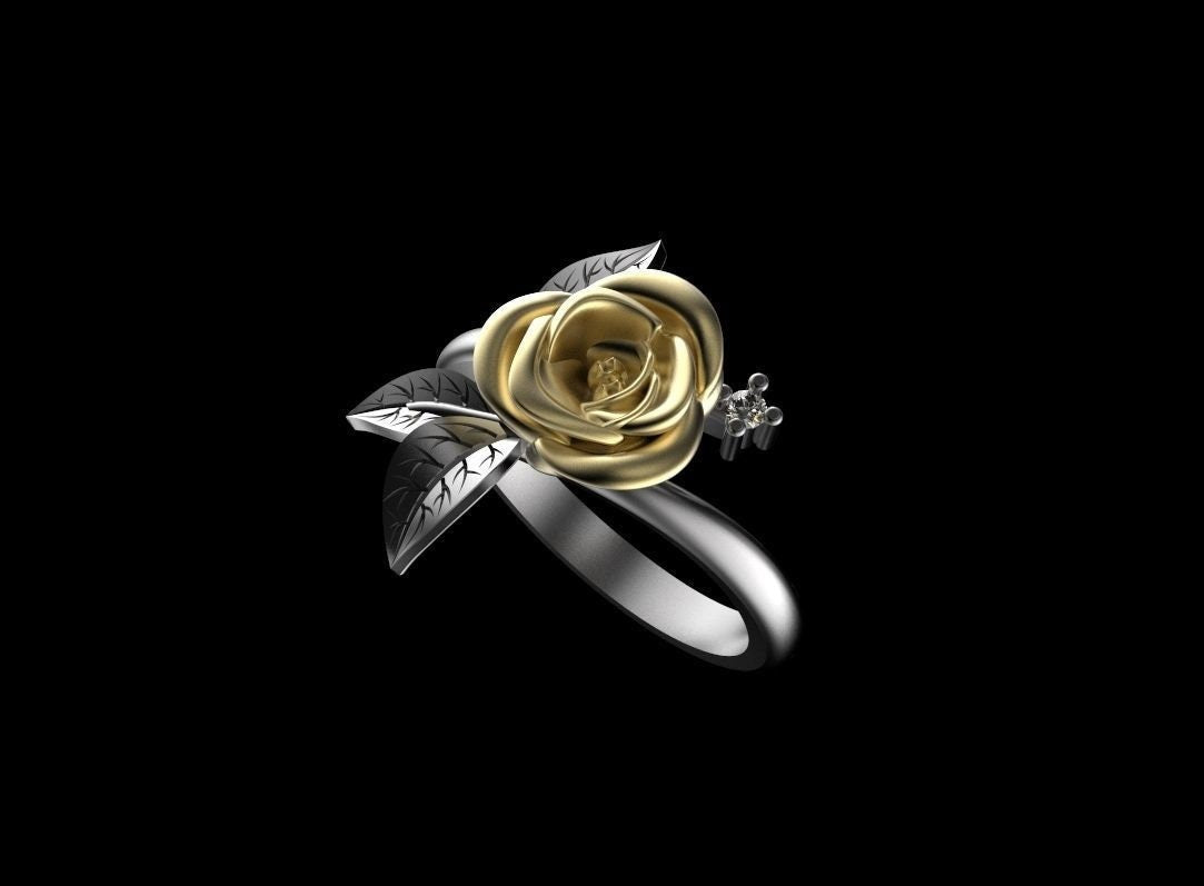 Sold OutAs this is a 2 tone ring, please let us know the color breakdown you prefer. Let us know what colors of gold (yellow, white, rose, green or plating combination) you would like for the rose and the ring.