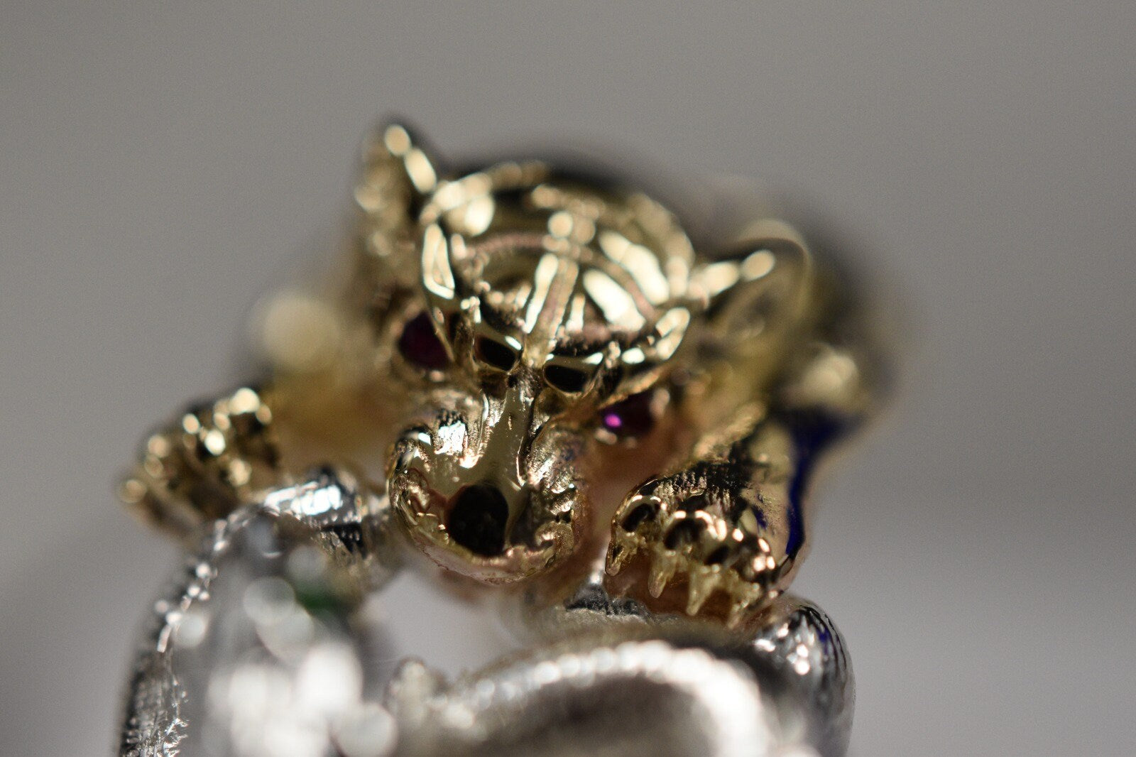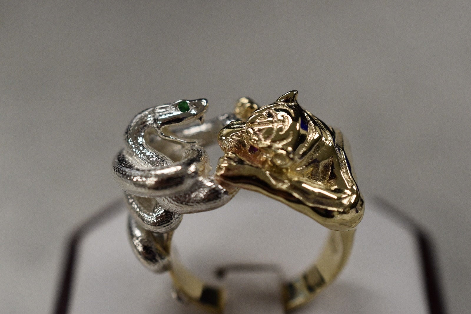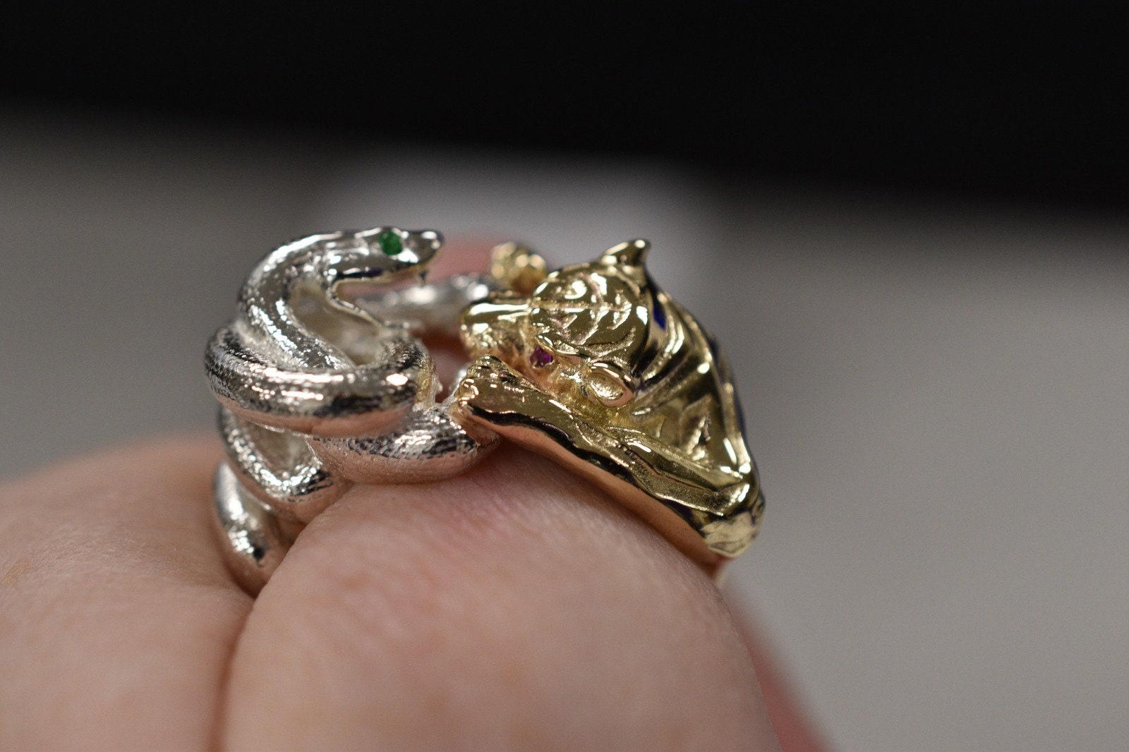 As this is a 2 tone ring, please let us know the color breakdown you prefer. Let us know what color gold (yellow, white, rose, green or plating combination) you would like for the snake and for the tiger.