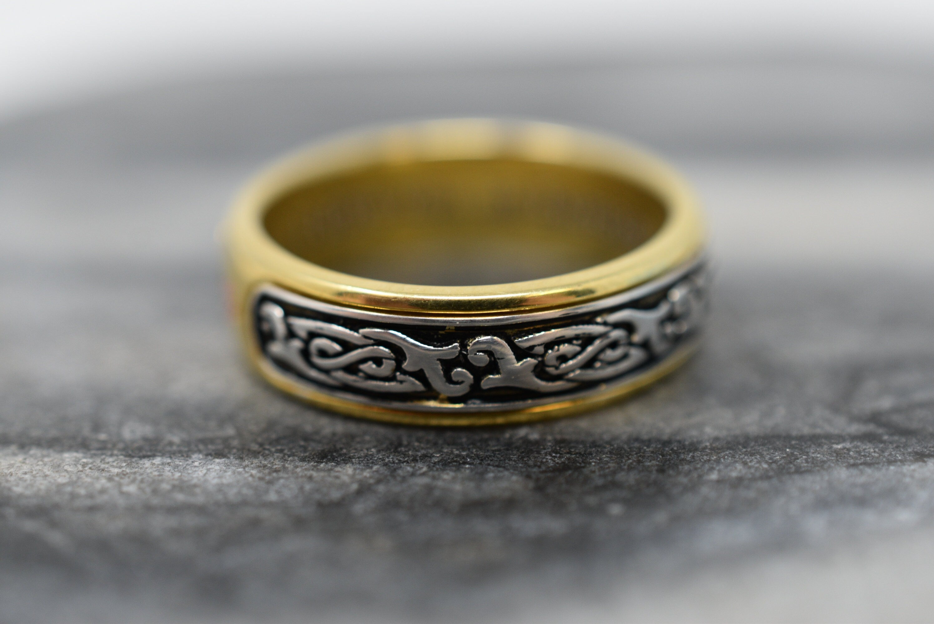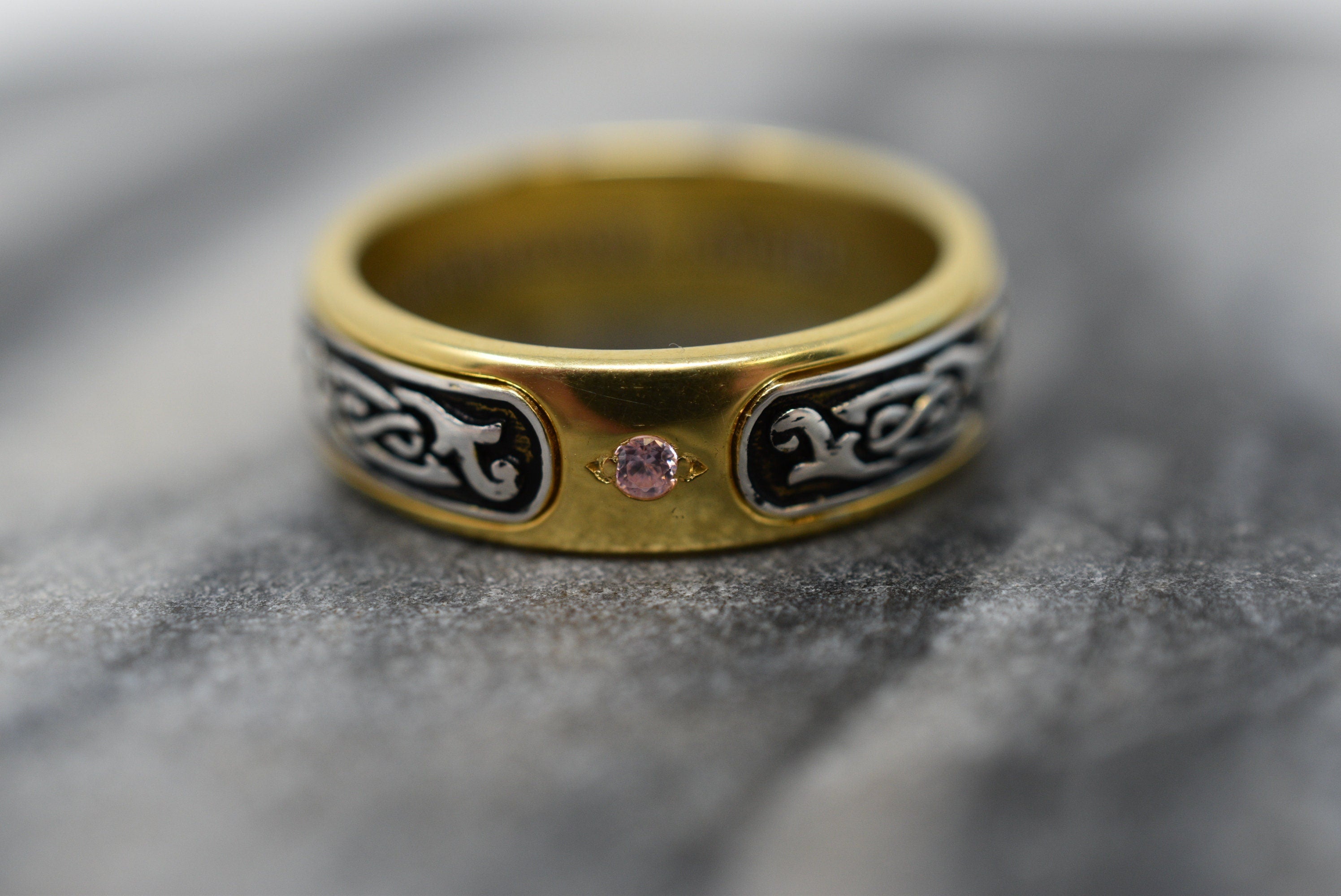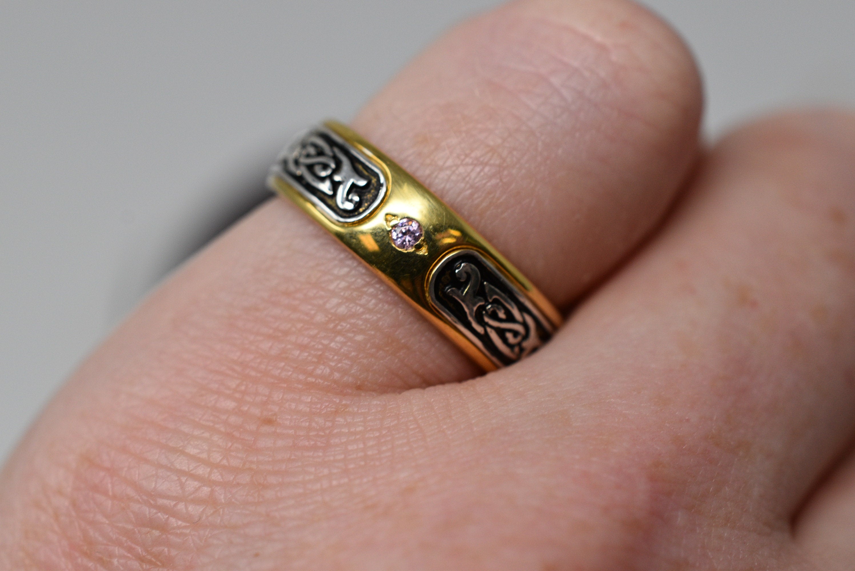 Sold OutAs this is a 2 tone ring, please let us know the color breakdown you prefer. Let us know what color gold (yellow, white, rose, green or plating combination) you would like for the middle design and the outer ring.