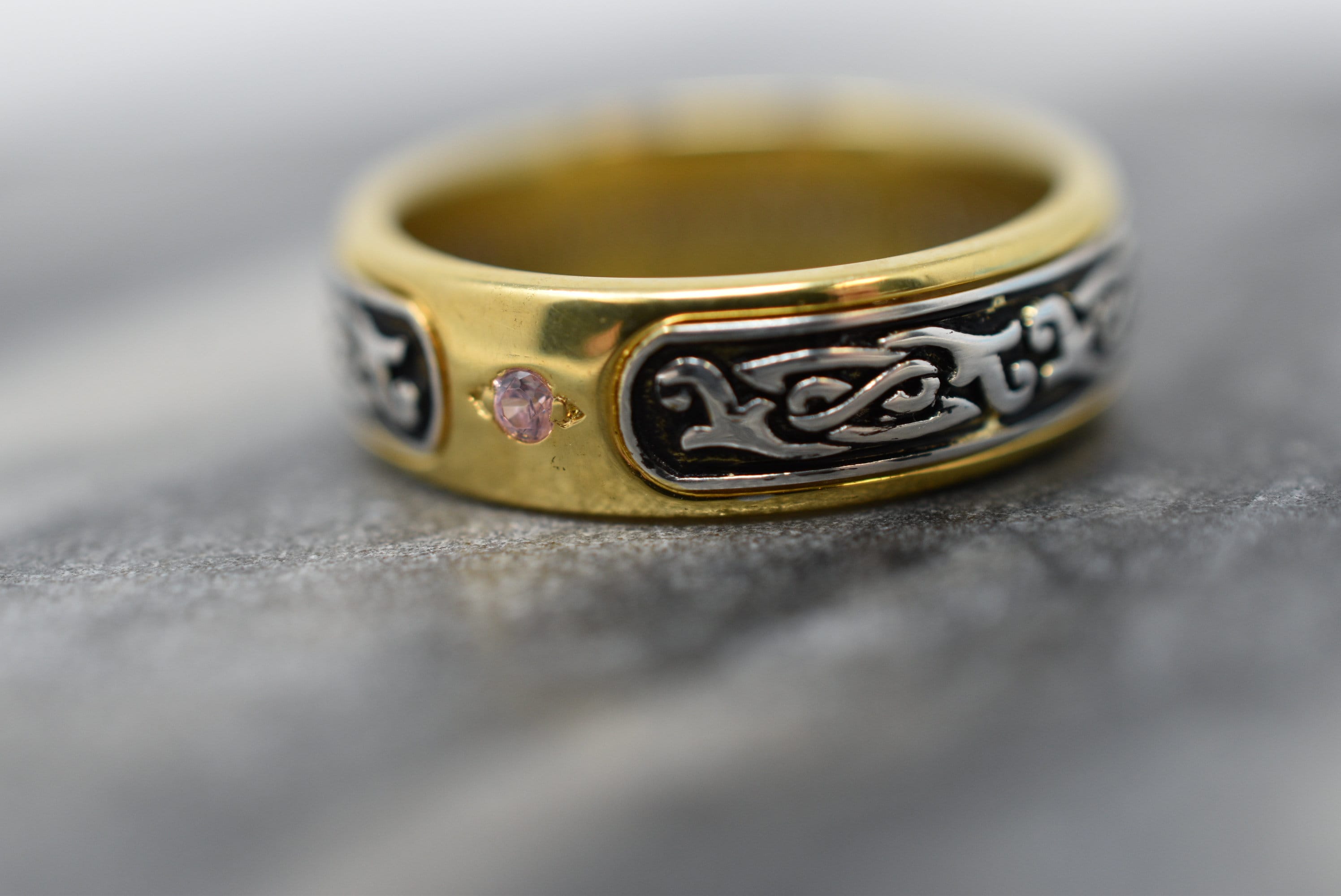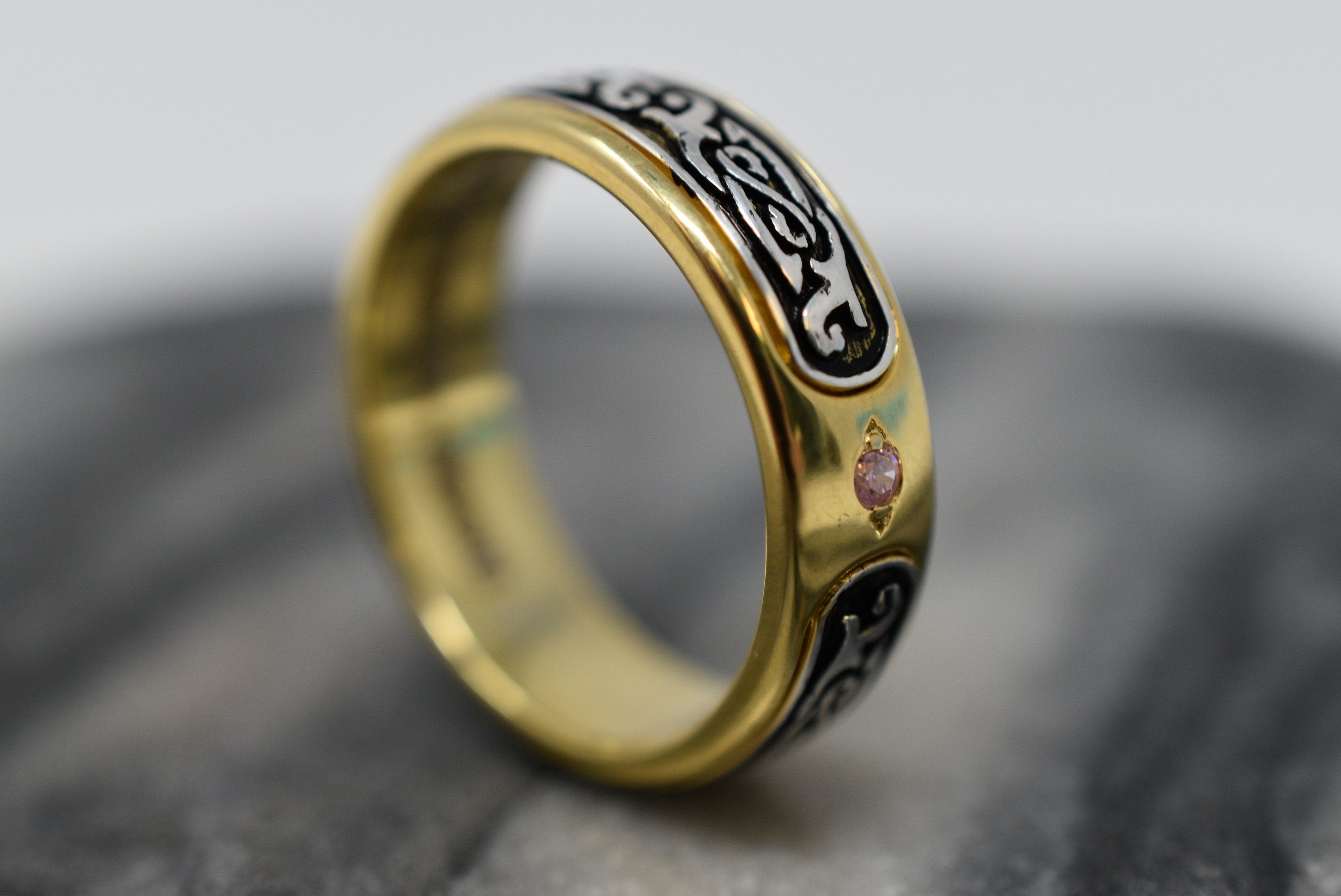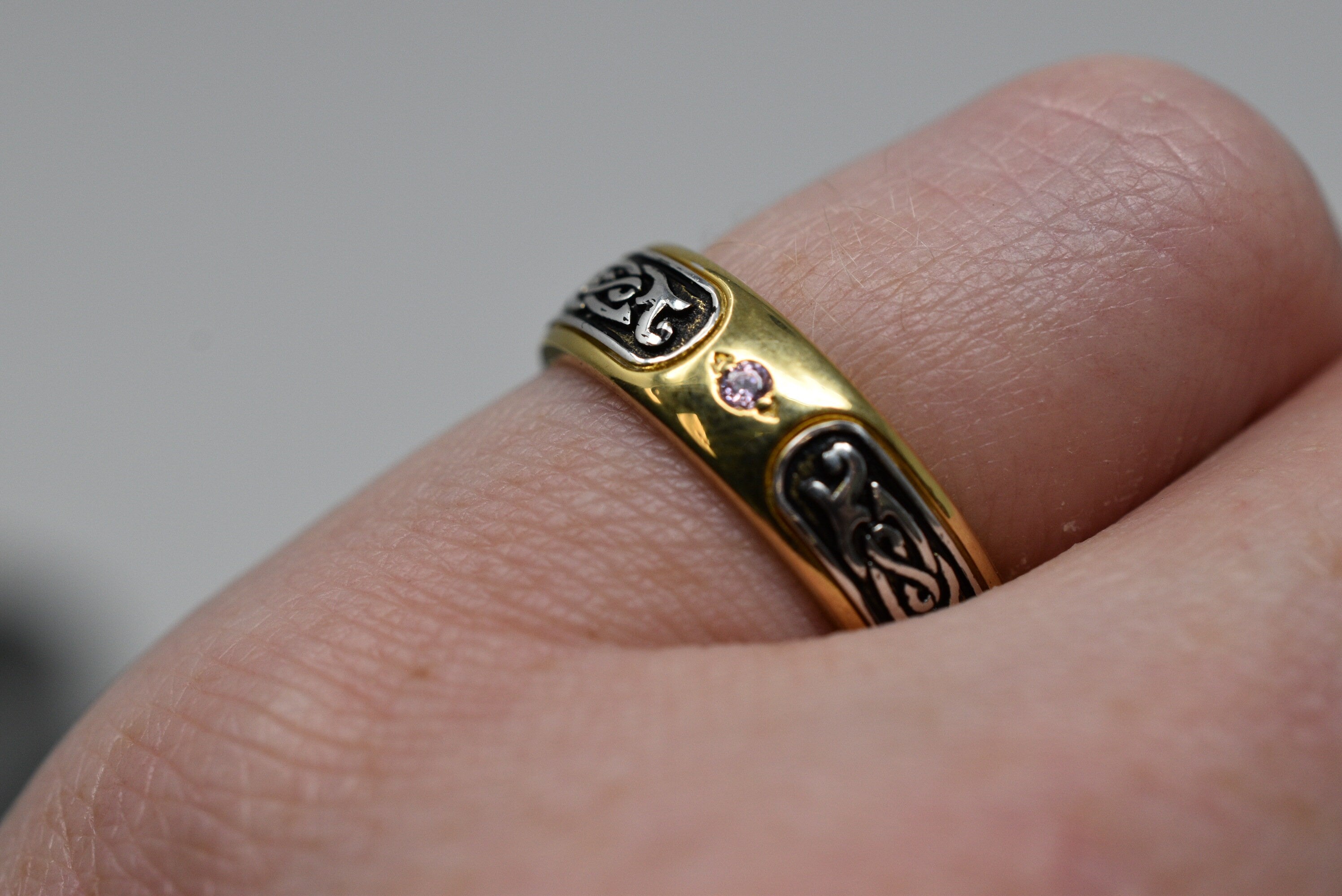Sold OutAs this is a 2 tone ring, please let us know the color breakdown you prefer. Let us know what color gold (yellow, white, rose, green or plating combination) you would like for the middle design and the outer ring.