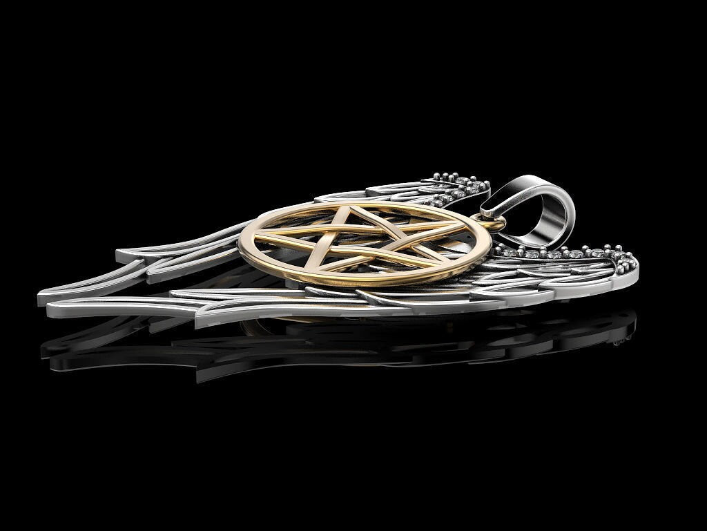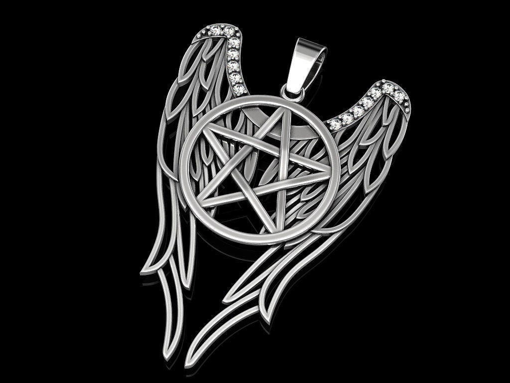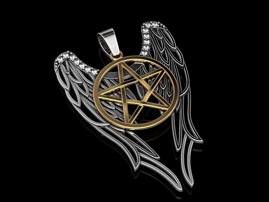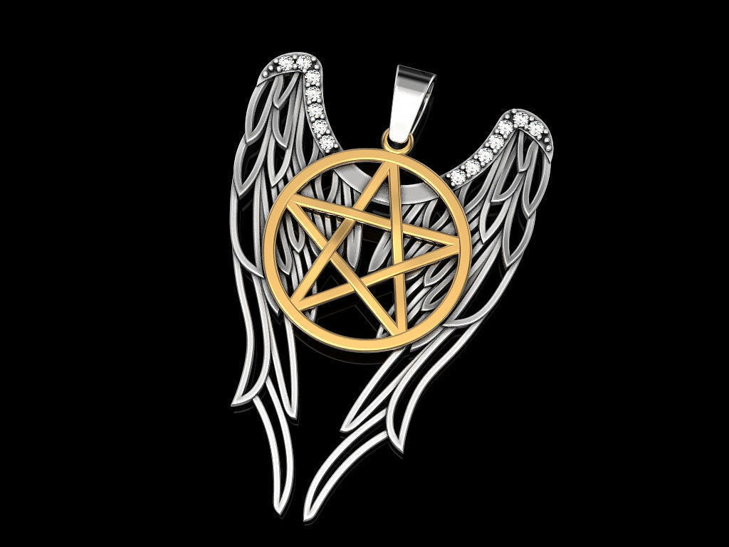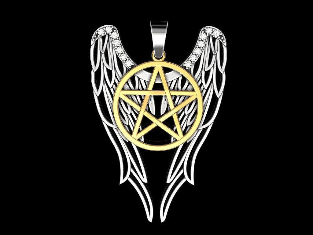Protection Pentagram Pendant *Moissanite With 10k/14k/18k White, Yellow, Rose Green Gold, Gold Plated & Silver* Wing Witch Wicca Punk Magic