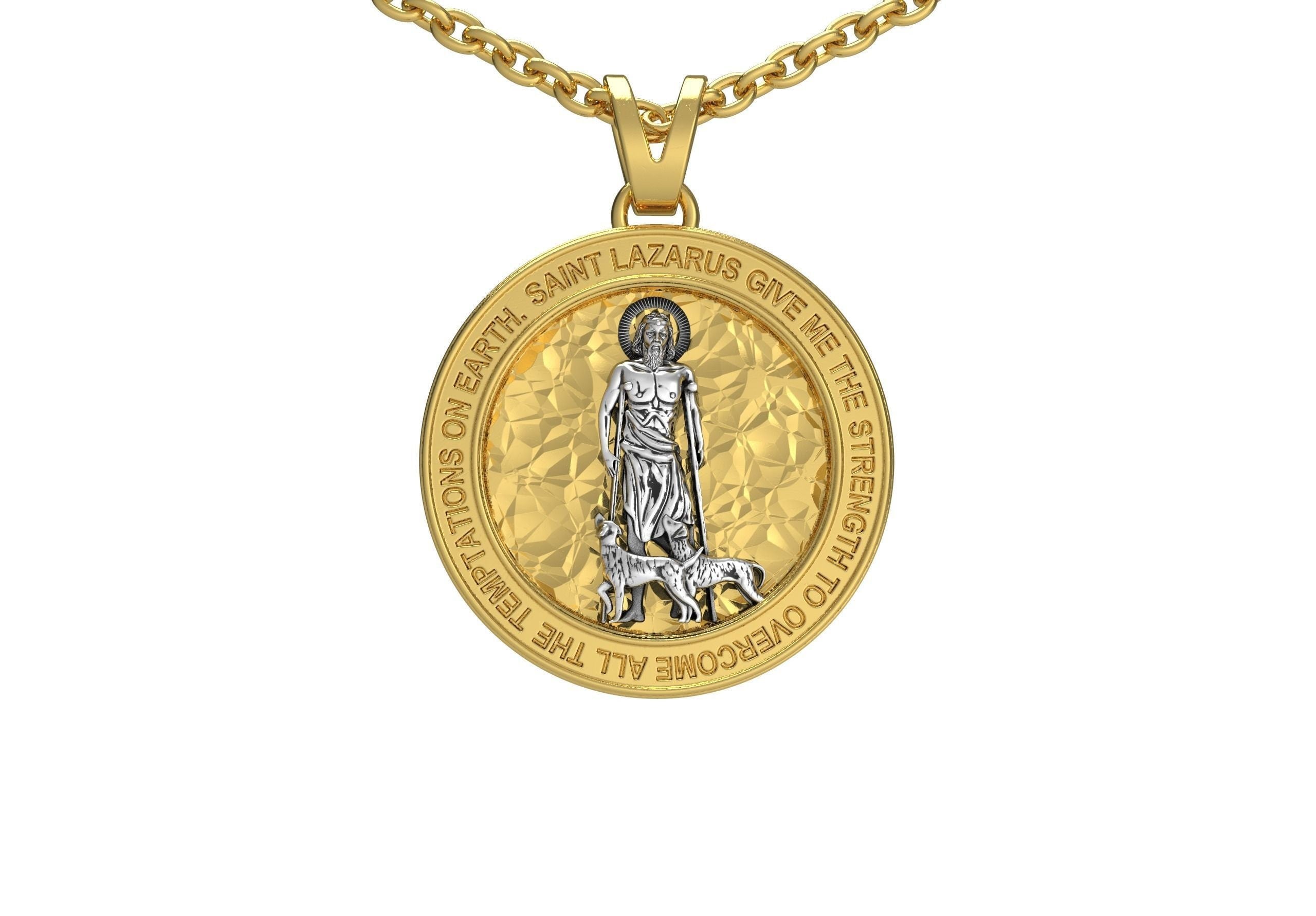 As this is a 2 tone pendant, please let us know the color breakdown you prefer. Let us know what color gold (yellow, white, rose, green or plating combination) you would like for St. Lazarus and the background