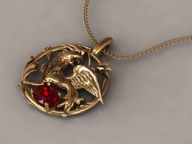 Winged Lion Pendant *Synthetic Ruby With 10k/14k/18k White Yellow, Rose, Green Gold, Gold Plated & Silver* Myth Fantasy LARP Charm Necklace