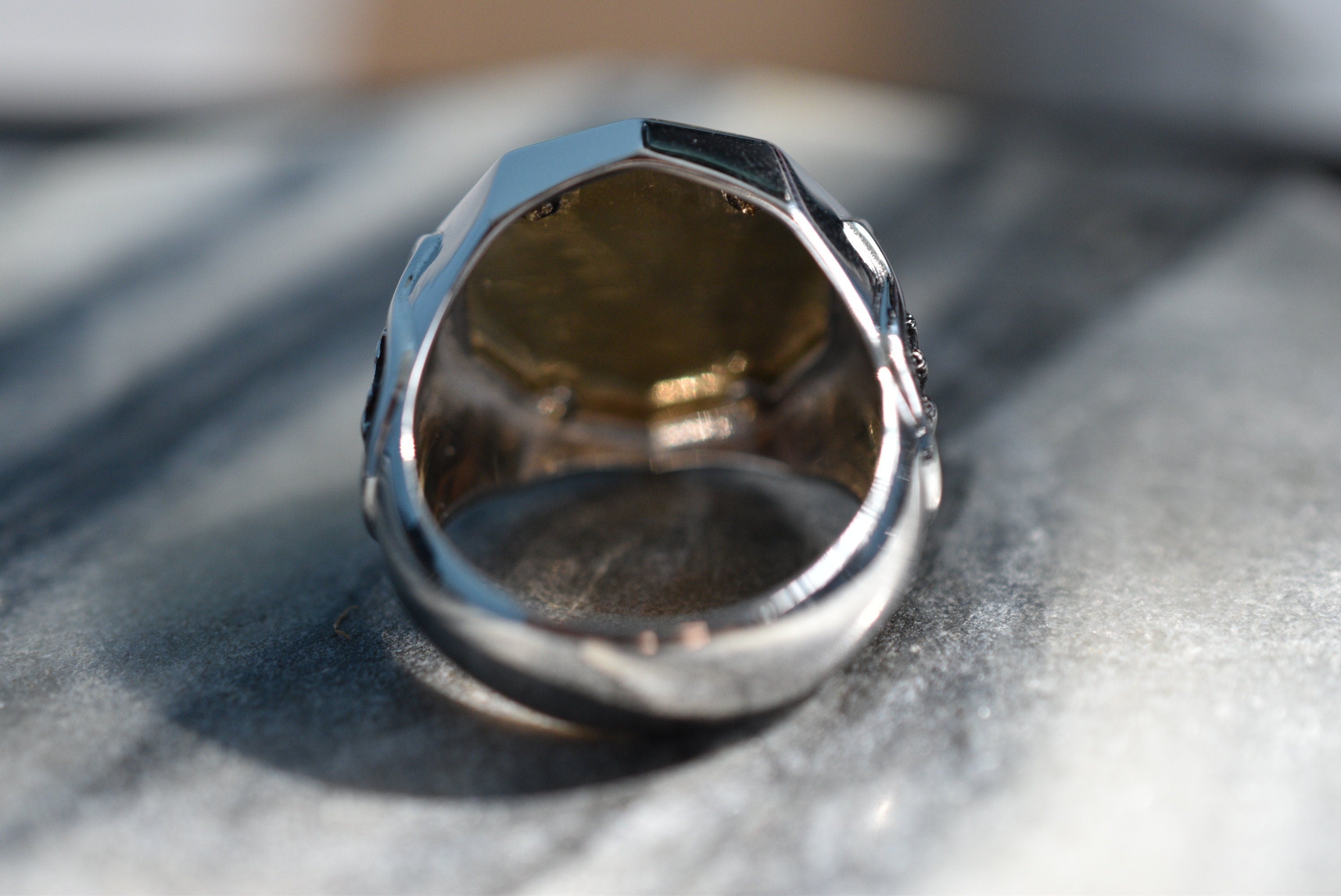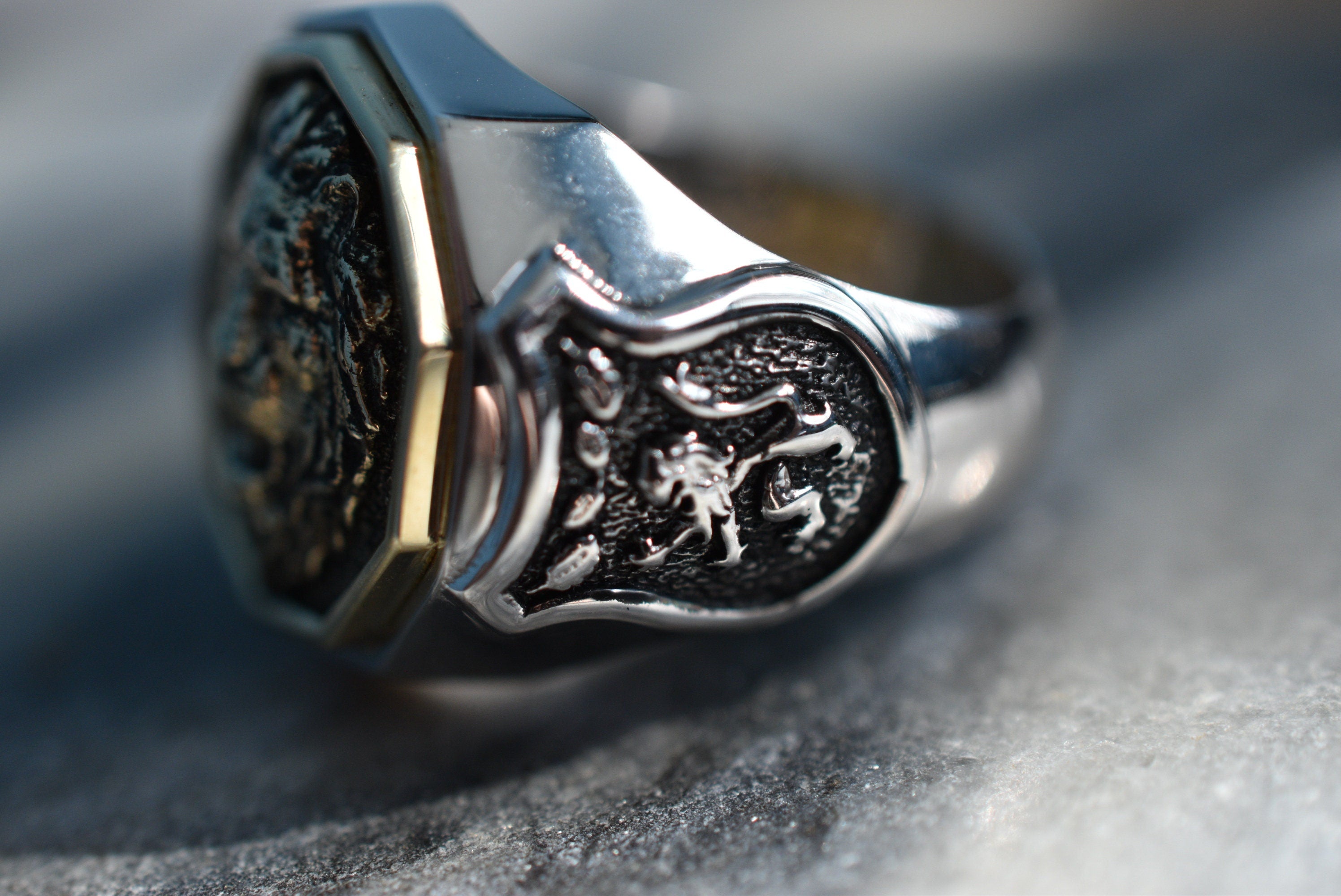 As well this ring is available with the side emblems or without. You can also to choose to have black antiquing added or not. Please let us know what you would like with purchase.