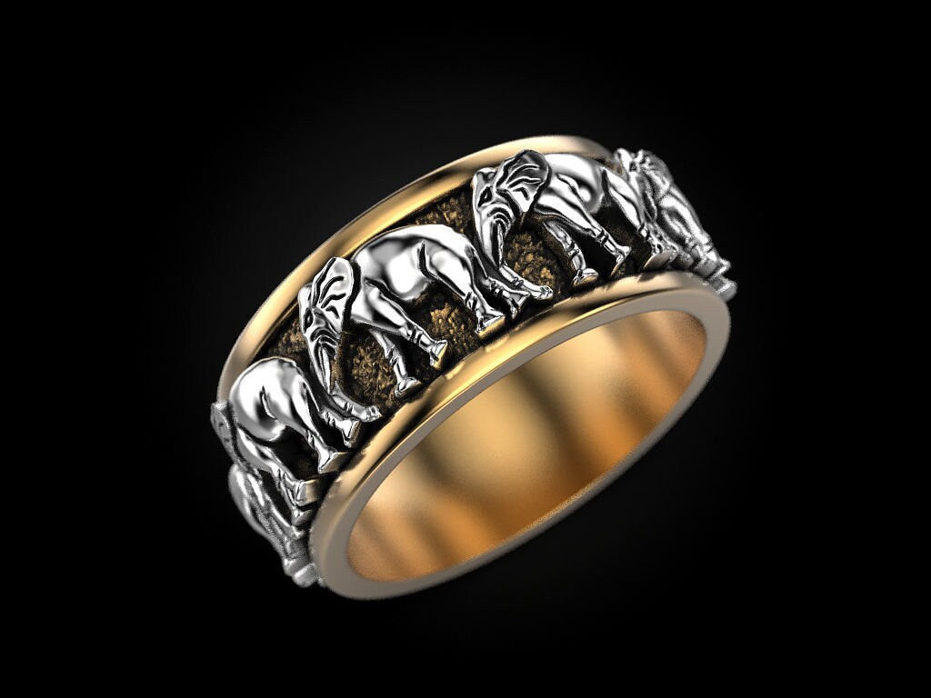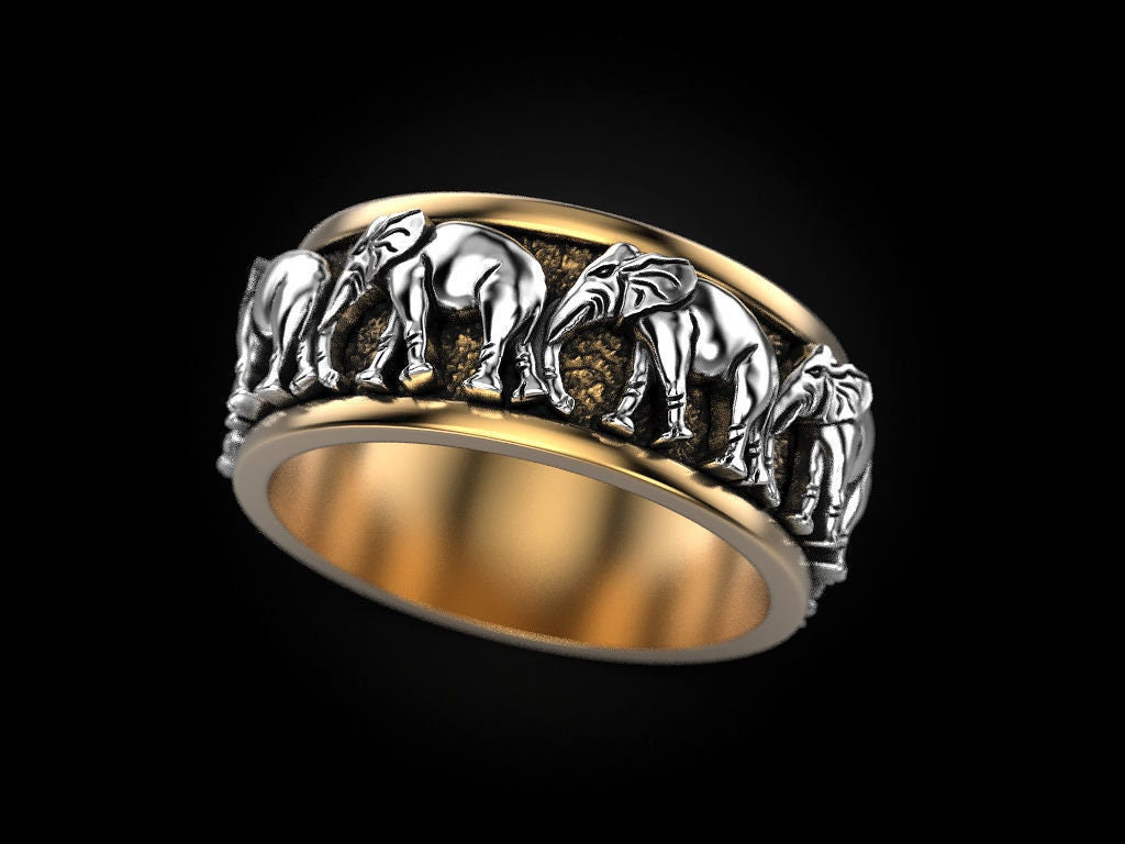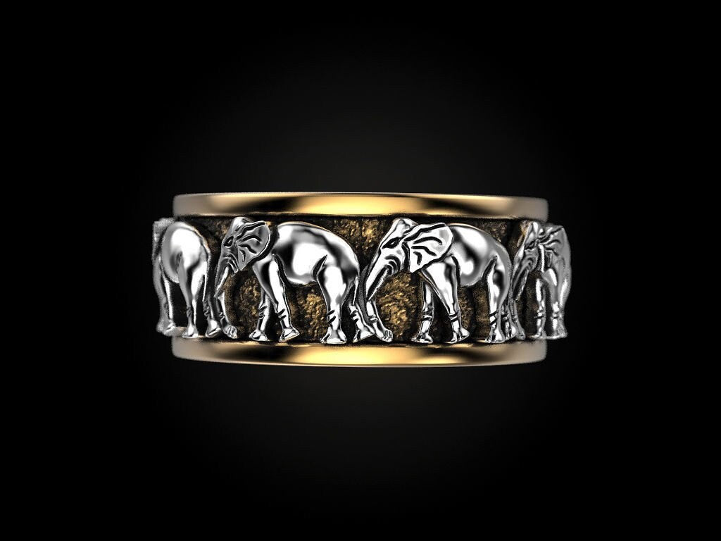 As this is a 2 tone ring, please let us know the color breakdown you prefer. Let us know what color gold (yellow, white, rose, green or plating combination) you would like for the ring and the elephants.
