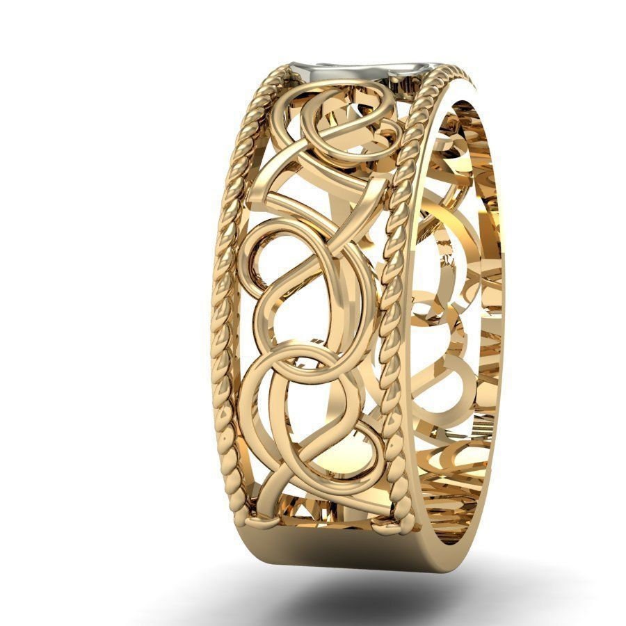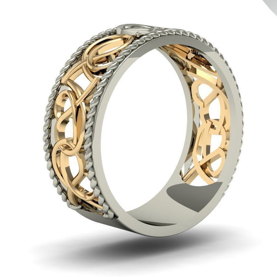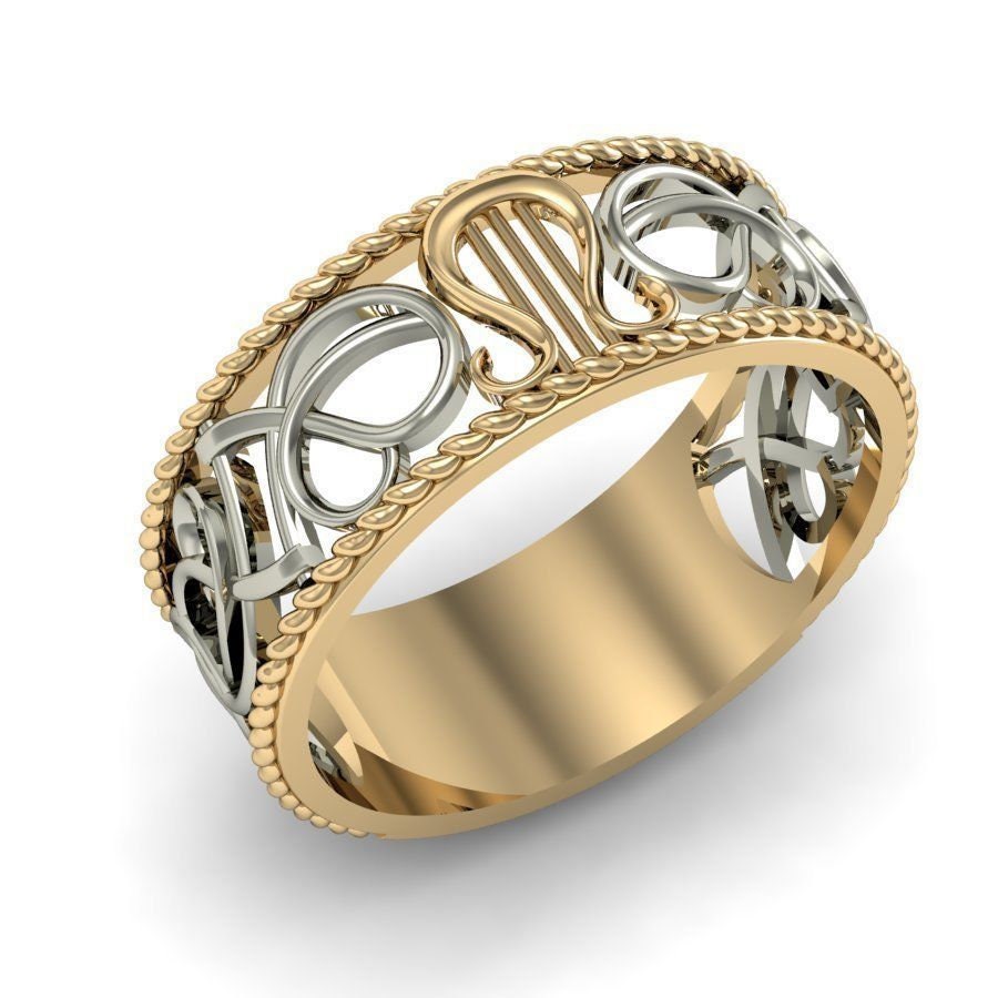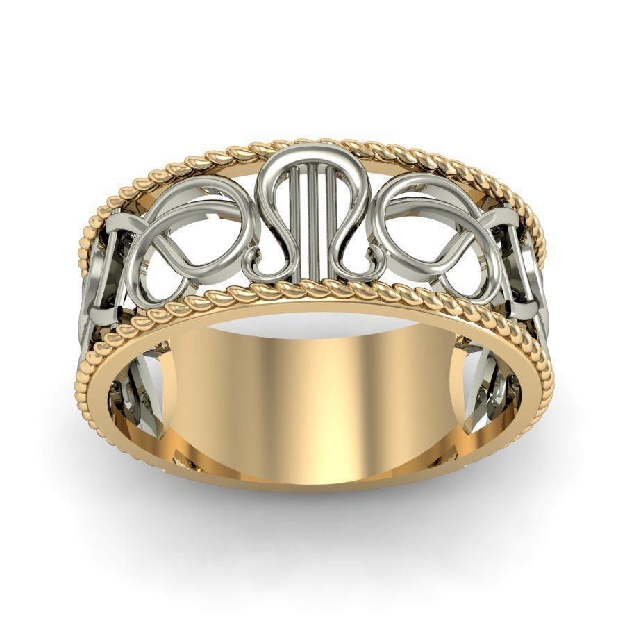 As this is a 3 tone ring, please let us know the color breakdown you prefer. Let us know what color gold (yellow, white, rose, green or plating combination) you would like for the top/bottom bands, the middle ornamental design and the lyre.