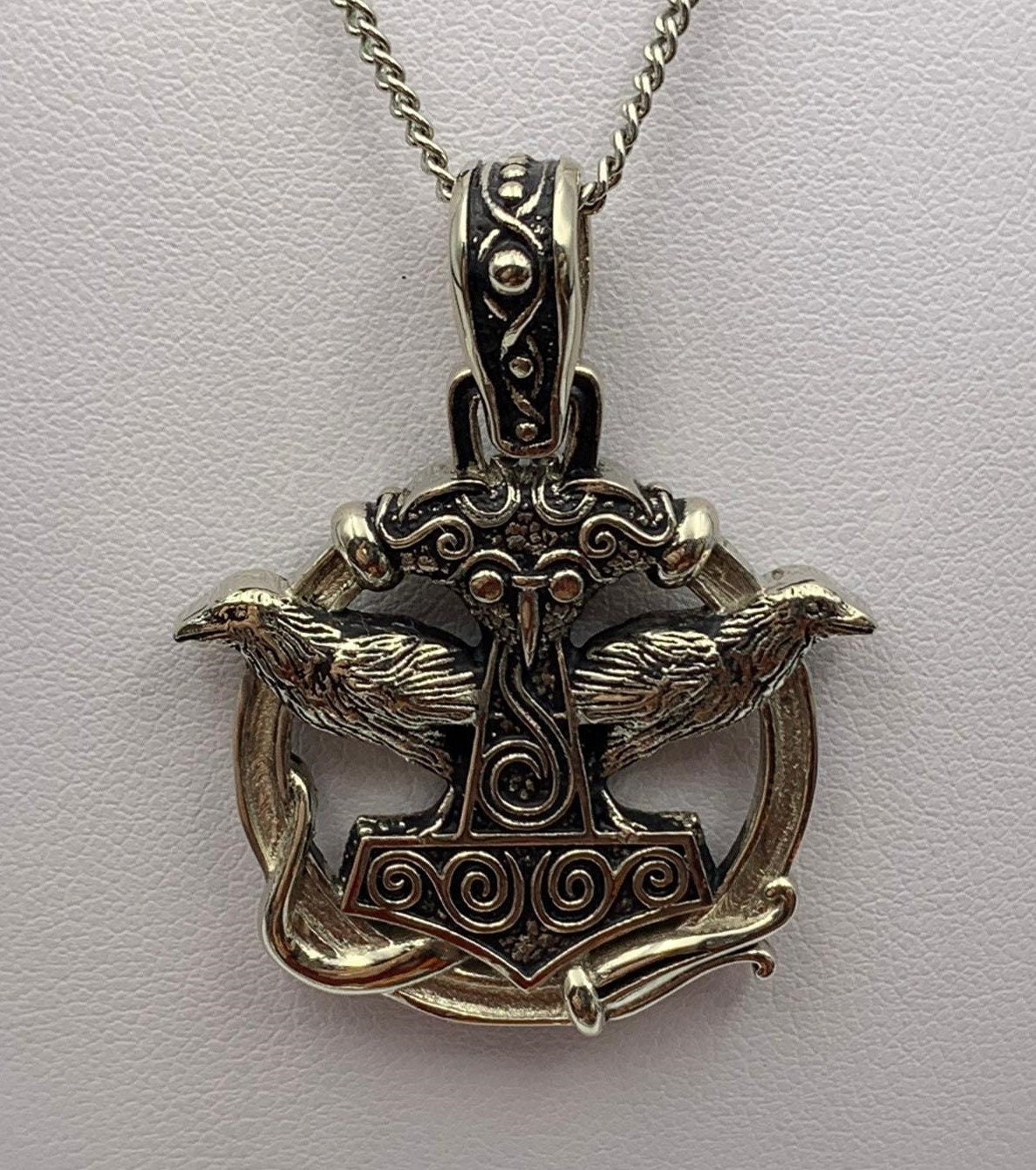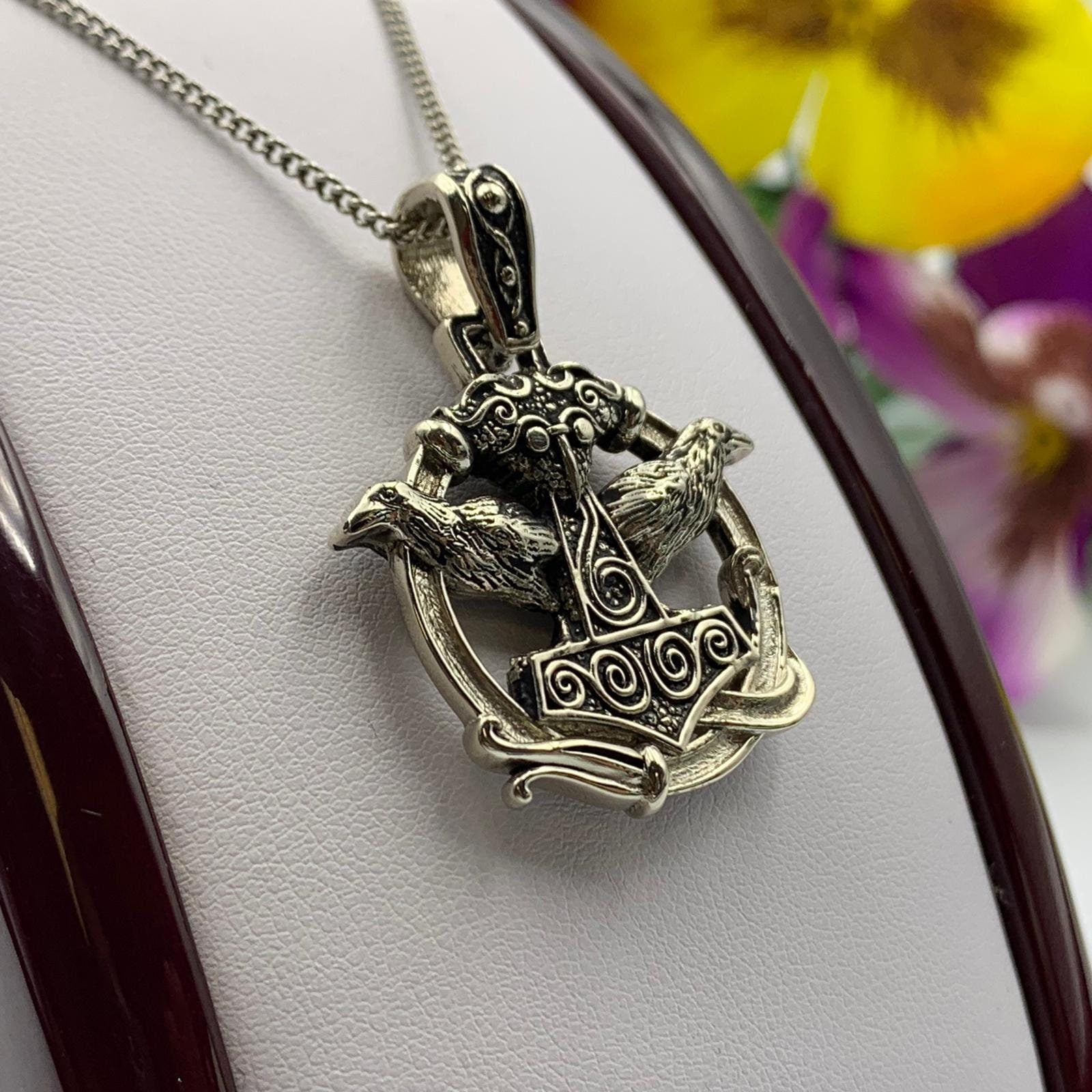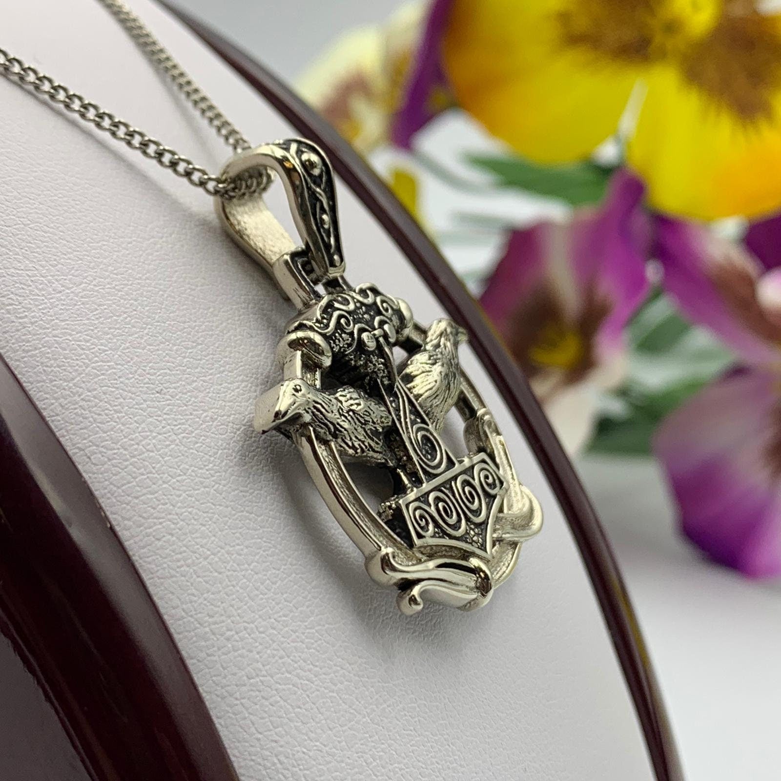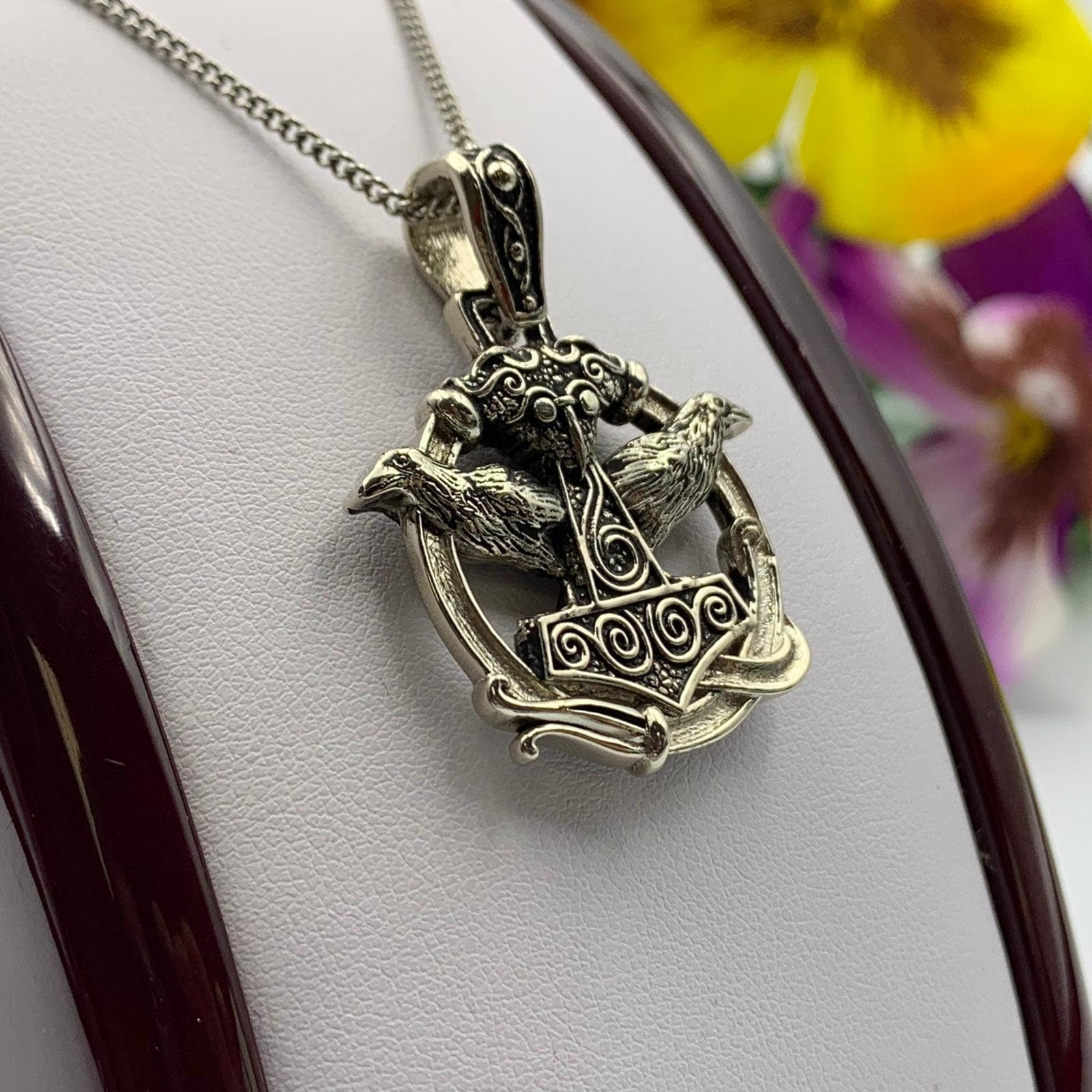 Thor's Hammer With Odin's Ravens Pendant *10k/14k/18k White, Yellow, Rose, Green Gold, Gold Plated & Silver* Viking Axe Charm Necklace Gift